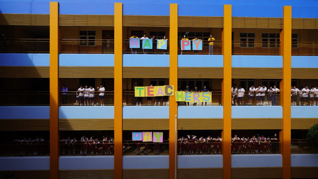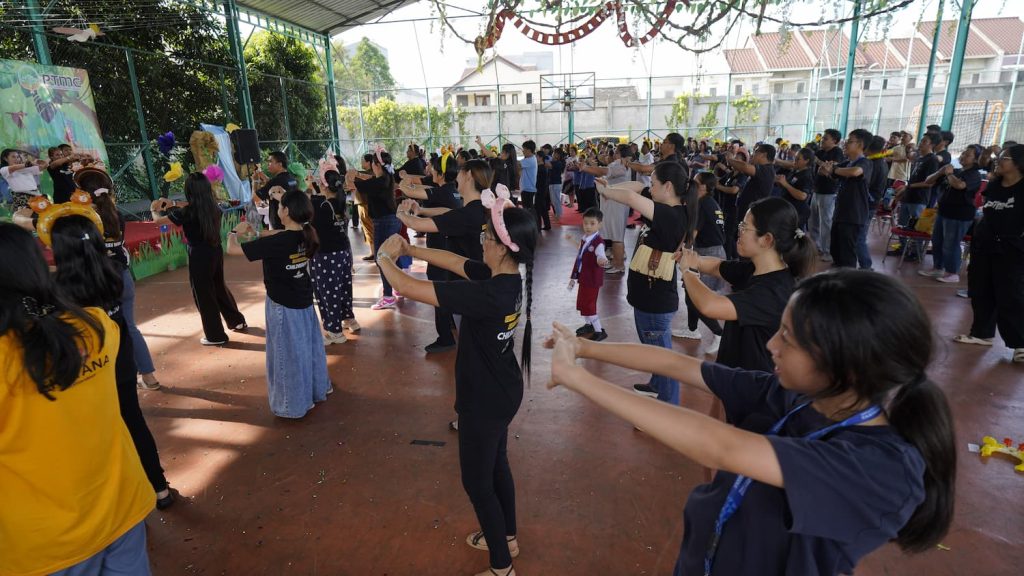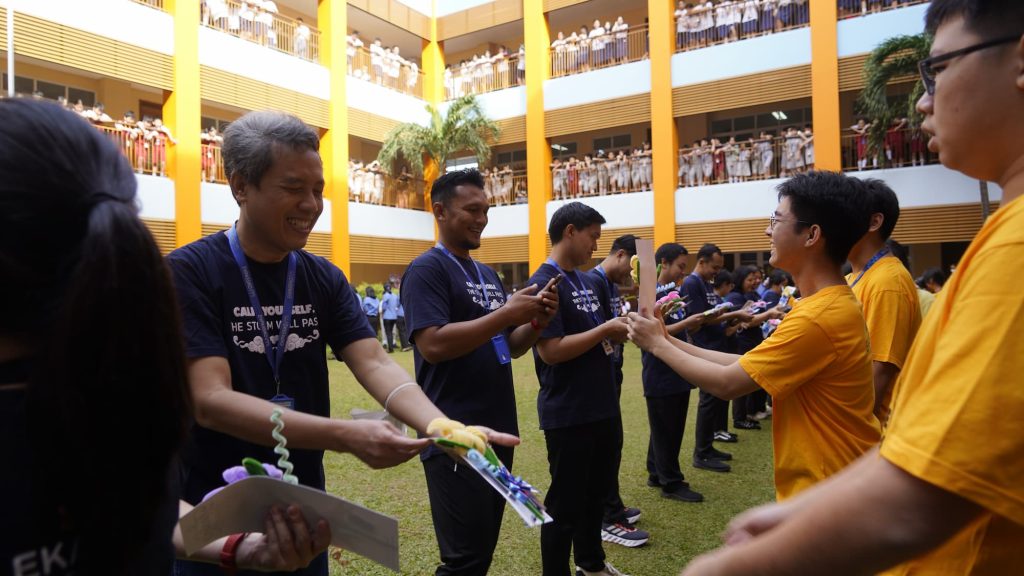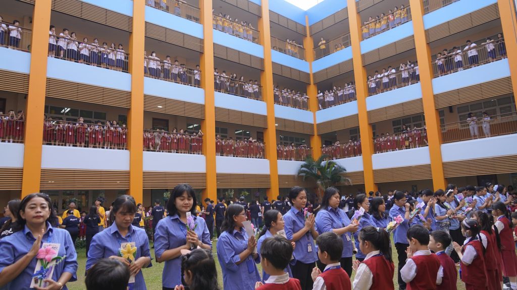 Rangkaian perayaan dimulai dengan kegiatan yang menghadirkan suasana hangat dan emosional. Seluruh guru dari jenjang TK hingga SMA berkumpul di tengah lapangan, sementara para murid berdiri mengelilingi area tersebut dari koridor lantai 1 hingga lantai 4. Dalam formasi yang rapi dan penuh kekhidmatan, murid menyanyikan Hymne Guru sebagai simbol penghargaan atas ketulusan dan jasa para guru.